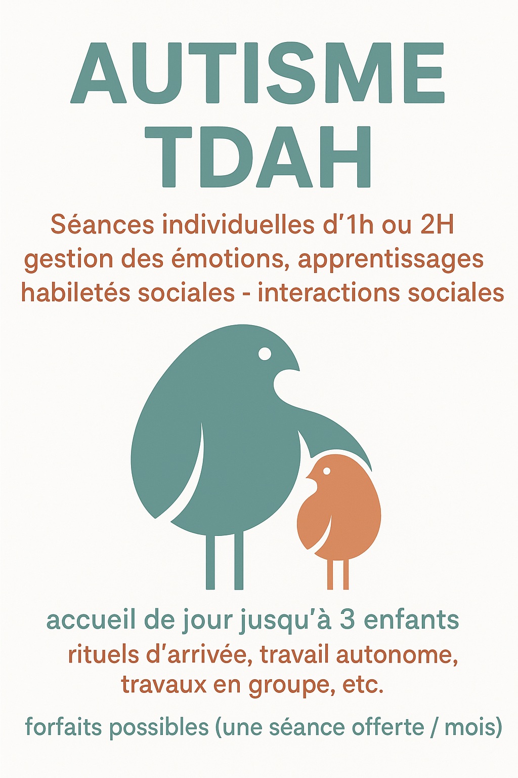 Mardi et jeudi en journée, 9h-12h / 13h30-16H30 – L’enfant vient durant les 3H. (75€)